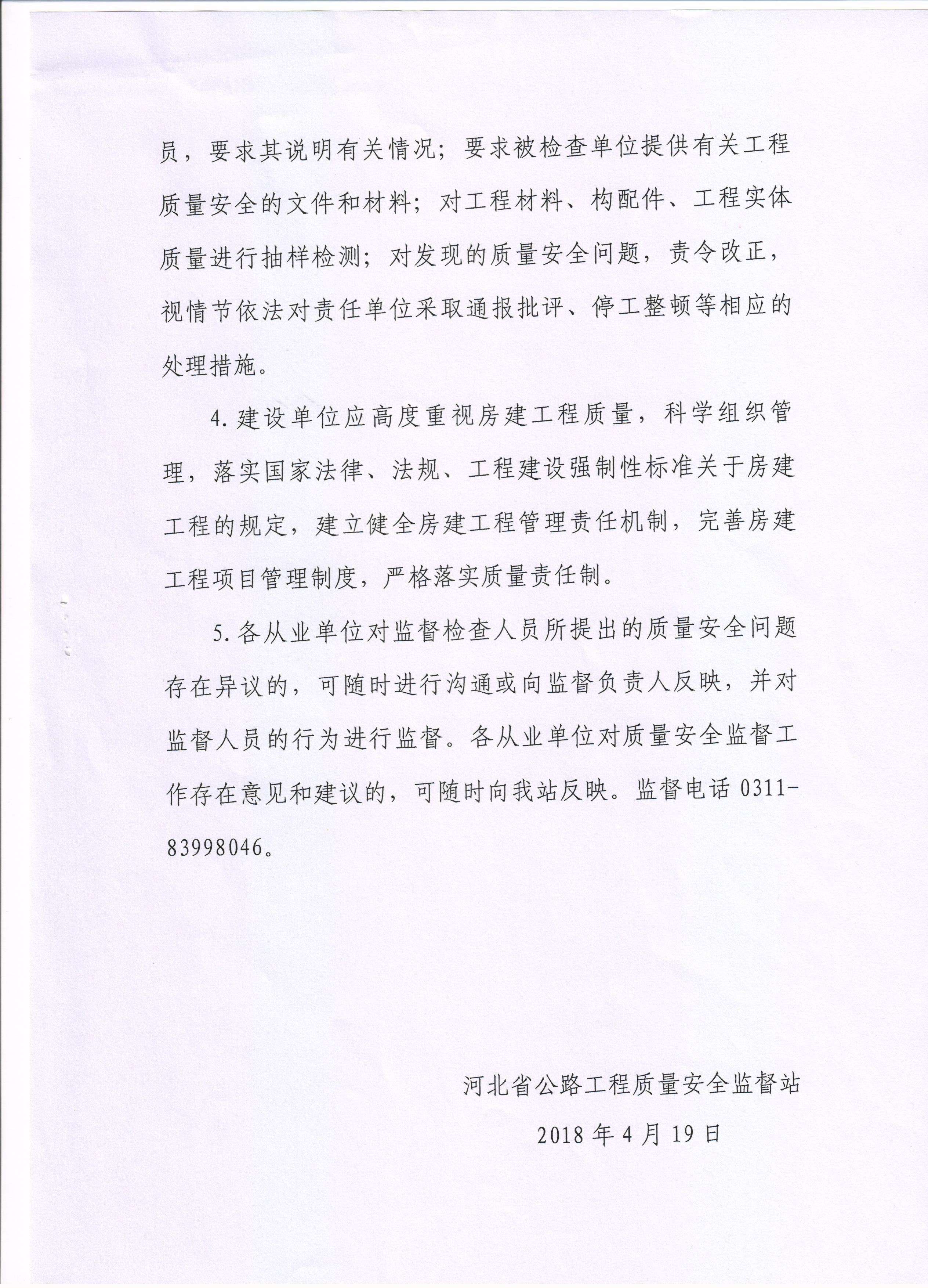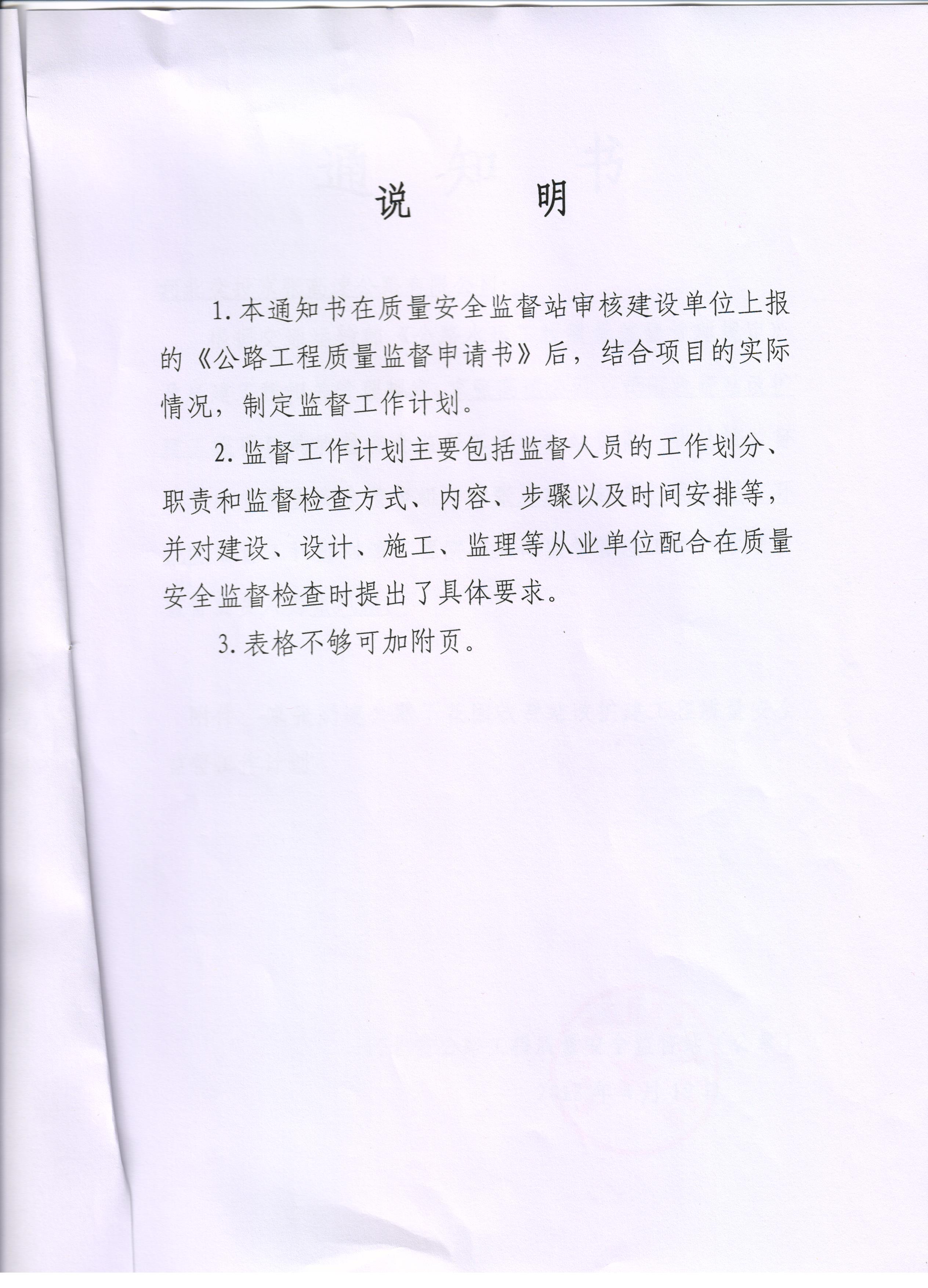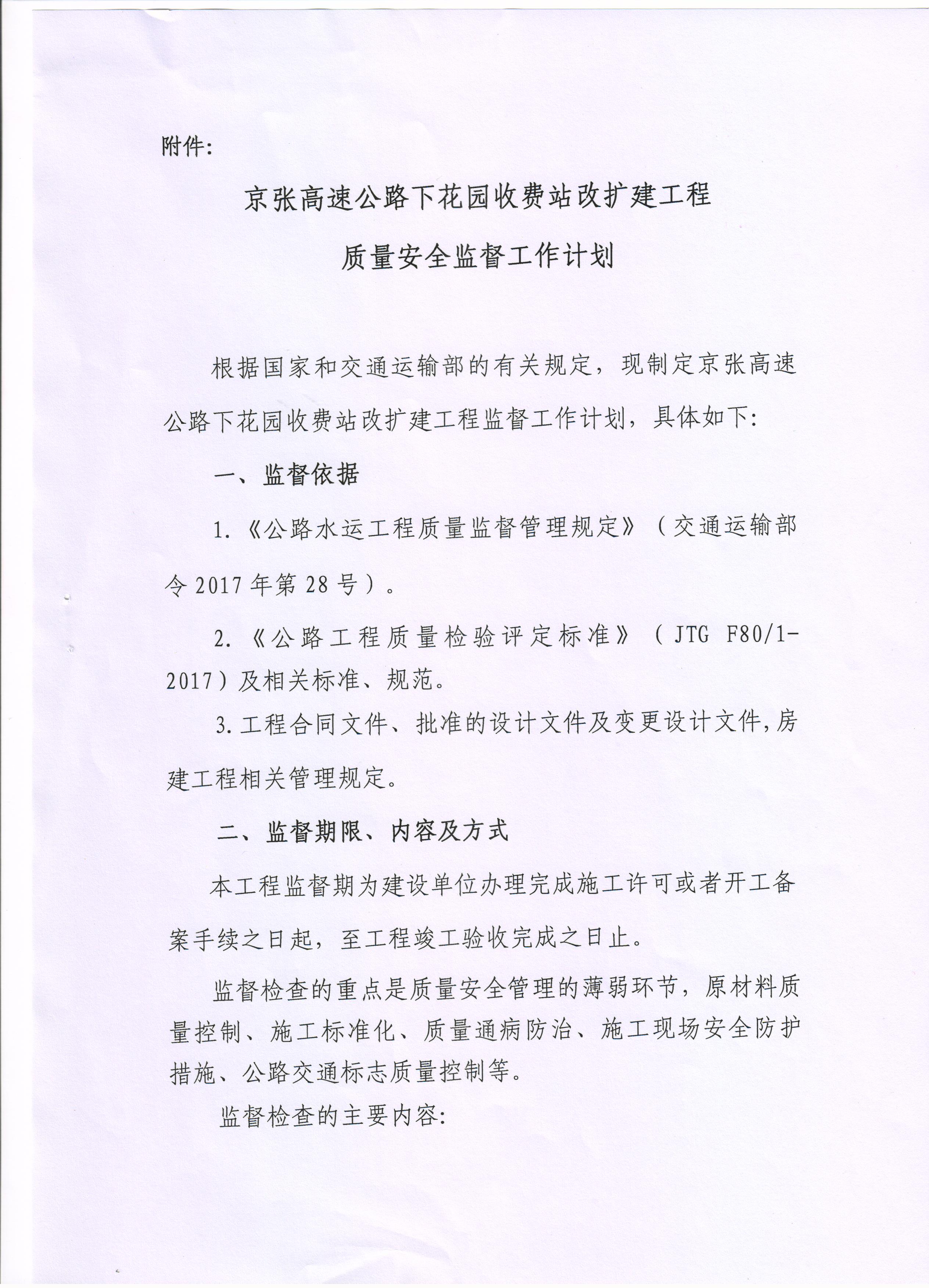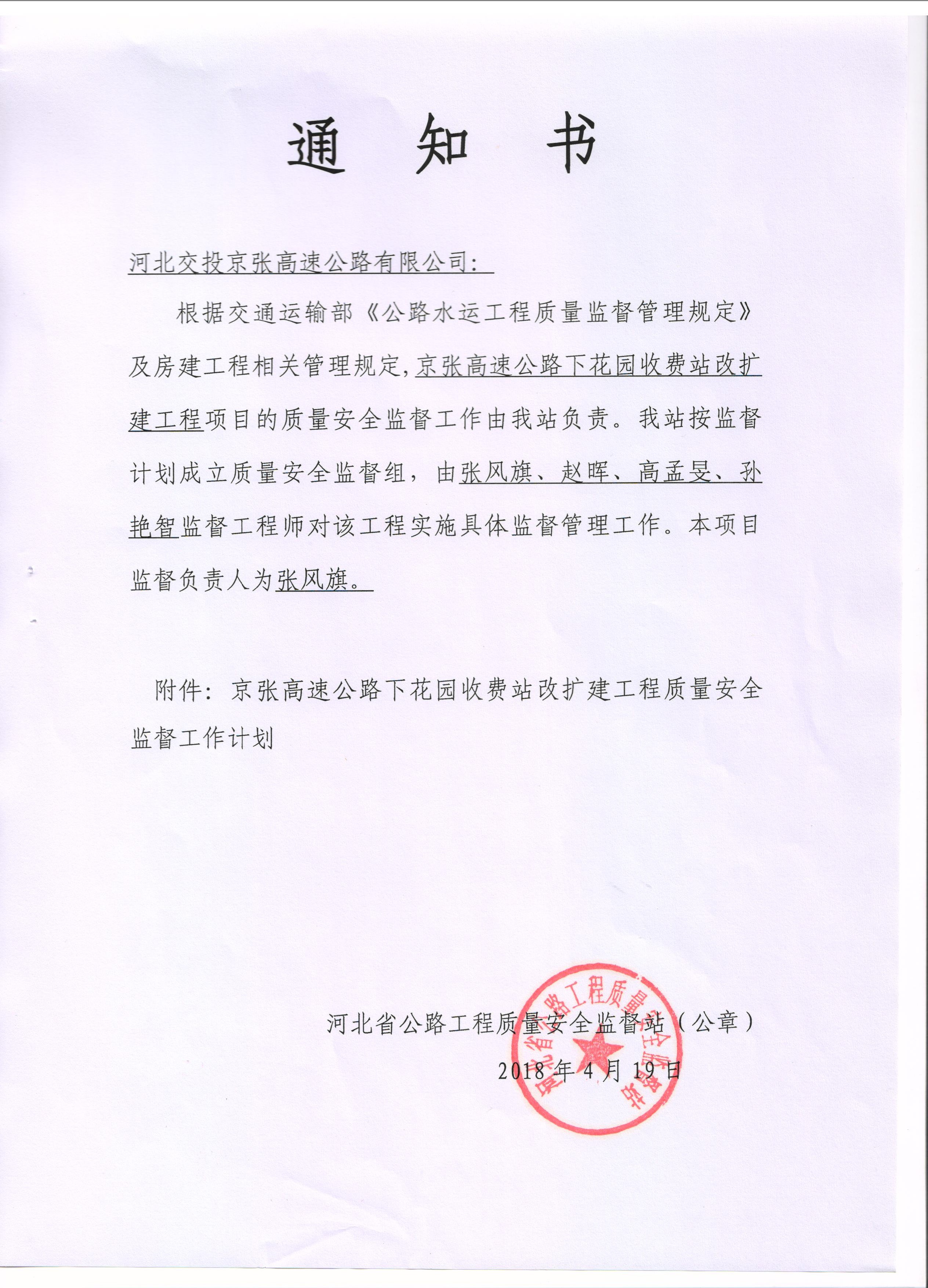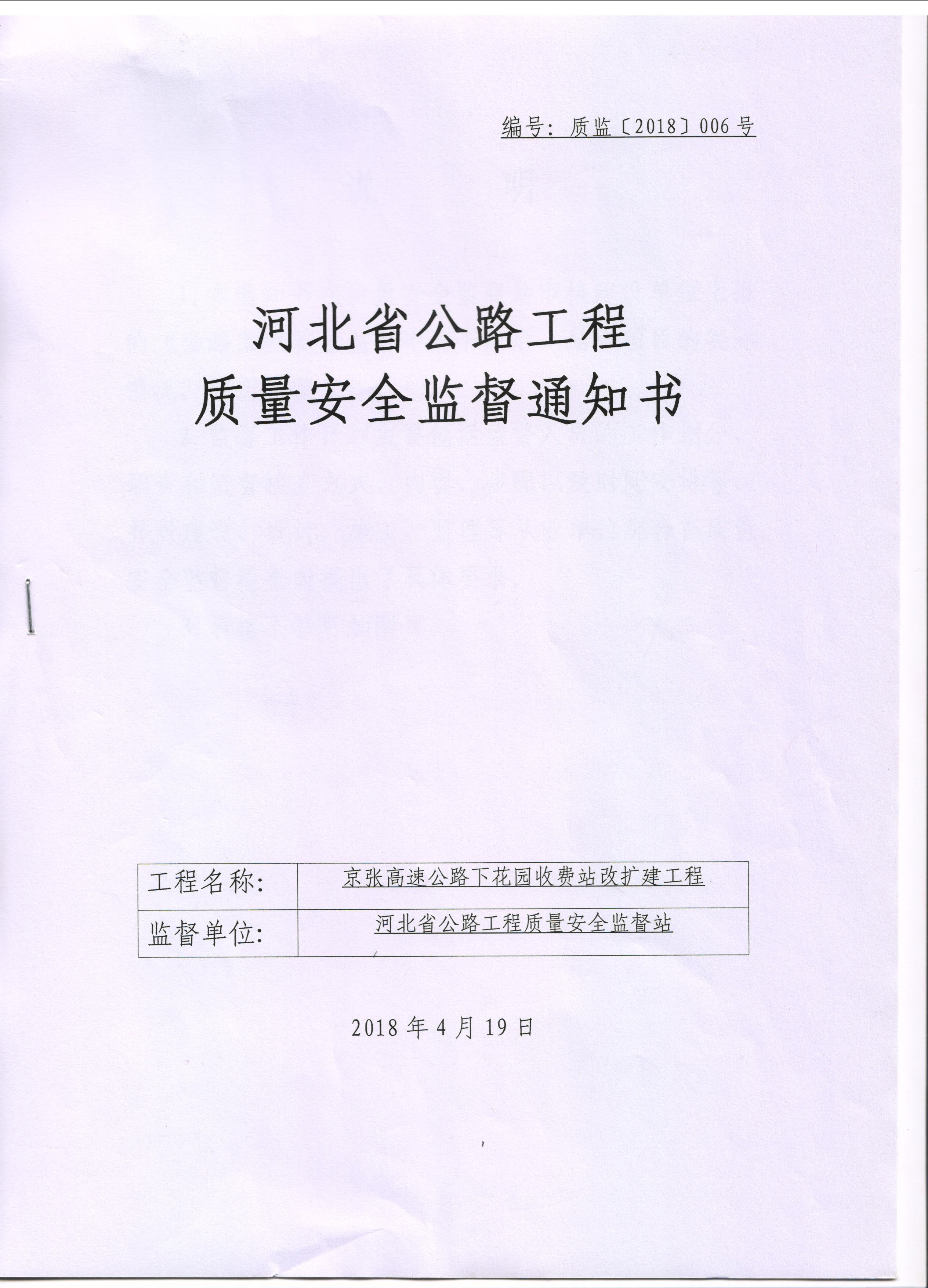 京張高速公路下花園收費站改擴建工程質量安全監(jiān)督通知書